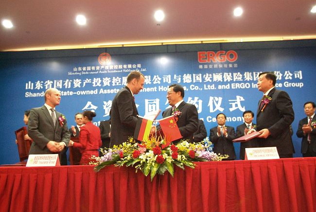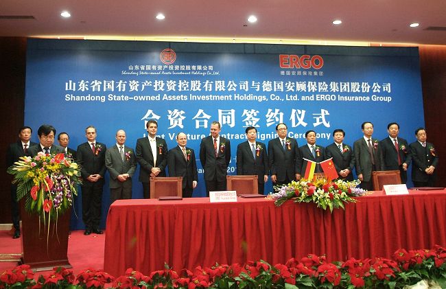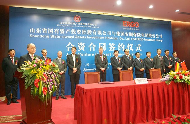 1月14日下午,公司与德国安顾保险集团在山东大厦举行设立合资寿险公司合资合同签约仪式。省委书记、省人大常委会主任姜异康,省委常委、常务副省长王仁元以及省国资委、金融办、发改委等有关部门主要负责人出席了仪式。