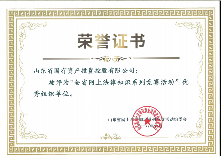 近日,省委组织部、省委宣传部、省普法办等11部门共同举办的“全省网上法律知识系列竞赛活动”结果揭晓。经过精心组织、周密安排,山东国投参赛人数及参赛比例在省属企业中综合排名第一,被评为优秀组织单位。通过本次竞赛活动,山东国投的“守法合规”公司文化更加深入人心,遵法、学法、守法、用法的氛围更加浓厚,员工的法律素质和法治能力得到进一步提升,取得了良好的普法效果。