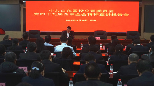 11月28日,山东国投公司党委在济南举行十九届四中全会精神宣讲报告会。省属企业宣讲团成员,山东国投公司党委书记、董事长李广庆作宣讲报告,省国资委“八推动一服务”联络小组成员、省国资委党委组织与统战工作处副处长庞爱华参加会议,公司党委副书记、总裁王洪主持报告会。