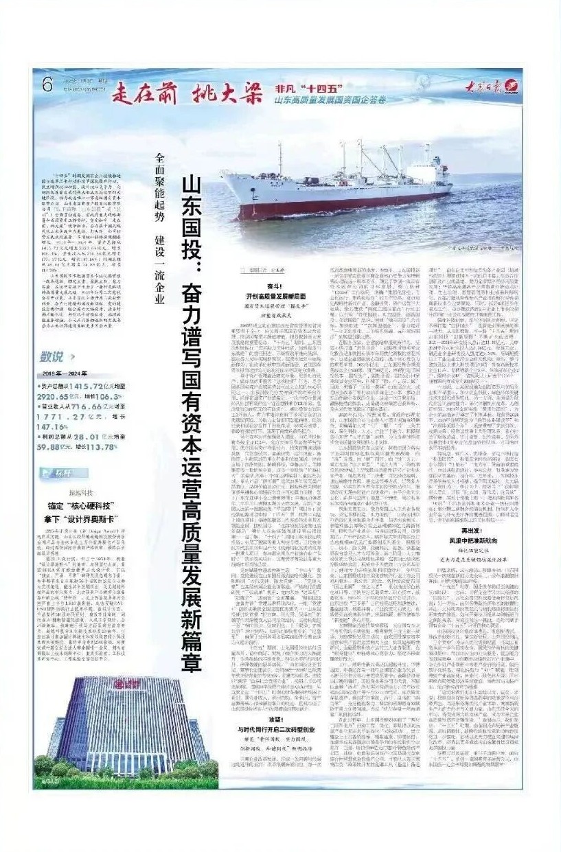 强化资本运营做强做大增量。山东国投拥有各级企业172户,充分发挥国资运营平台作用,优化国有资产增量投向,投资管理领域涉及新一代信息技术、金融投资、远洋渔业、新能源、生物医药等重点行业和关键领域,培育发展了浪潮集团、超越科技、中鲁远洋、华特集团等一批优势企业。这是一份持续“扩容壮大”的做优名单:华特达因深耕儿童医药领域,拳头产品“伊可新”连续20多年居同类产品首位,品牌价值达37亿元;超越科技为国家诸多关键核心领域提供自主可控算力支撑,登上山东先进中小企业榜单榜首;中鲁远洋2025年上半年出口规模实现历史性突破,创新产业园入选第一批国家级“平急两用”项目库;国控新能源成功中标“十四五”第二批集中式陆上风电项目;华特拓疆第三代波浪能发电技术领跑全国、接轨国际,“全海域波浪能发电装备制造”项目入选海洋强省建设重点项目库……据了解,“十四五”期间山东国投陆续投资、布局了国家级重大科技专项、三代核电技术代表项目和国产大飞机商用航空发动机等一批重大项目,参与国家重点产业链企业“卡脖子”技术攻关项目,国有资本有效服务重大战略作用持续凸显。