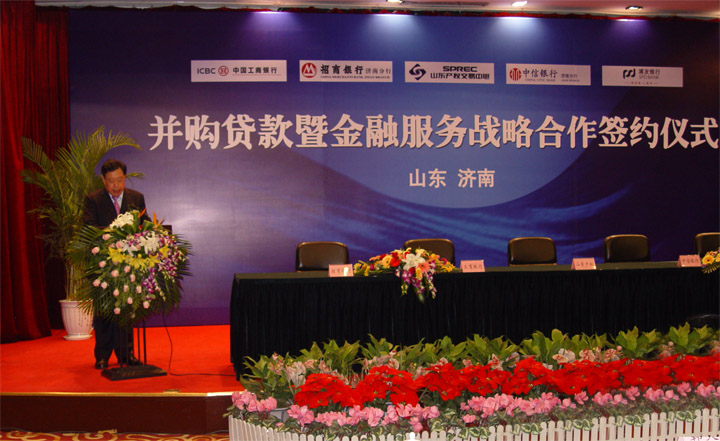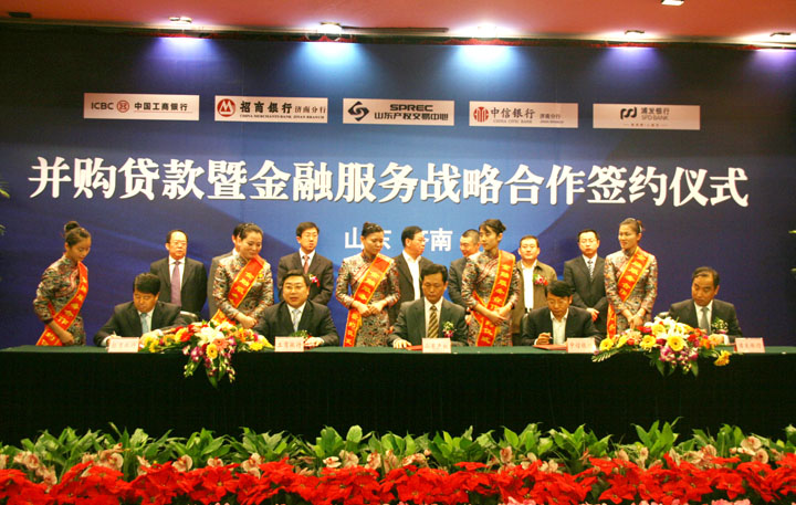 2009年11月6日上午,山东产权交易中心与工商银行、招商银行、中信银行、浦发银行并购贷款暨金融服务战略合作签约仪式在济南隆重举行。省国有资产管理委员会副巡视员韩成峰、省国有资产投资控股公司总裁刘长锁以及工商银行山东分行副行长王跃民、中信银行济南分行行长侯训义、招商银行济南分行副行长吕成玉、浦发银行总行公投部总经理杨斌等领导出席了此次签约仪式。山东产权交易中心与四家商行将联合为我省企业并购推出总额达310亿元人民币并购贷款资金。 省国资控股公司刘长锁总裁主持签约仪式,并致开幕辞。省国资委副巡视员韩成峰进行讲话,肯定了交易中心作为我省资本市场平台的重要作用,高度重视此次交易中心与各大银行的合作,并表示省国资委将在客户资源等方面提供有力支持。交易中心总经理苗伟在讲话中表示,由于拥有遍布全球的投融资网络,专业的团队、娴熟的资本运营技巧以及丰富的人际资源网络,交易中心将在企业和银行间牵线搭桥,提供规范、高效、低成本的专业服务。 根据协议,山东产权交易中心将利用资本市场平台优势,与银行展开并购贷款领域的全方位合作:贷款发放前,向银行推荐具有并购贷款需求的优质企业或项目;贷款发放过程中,作为第三方资金结算平台,帮助银企双方完成资金监管和划转,协助银行进行股权价值评估和质押;贷款发放后,如果出现风险,协助银行进行质押股权处置。 作为我省企业国有产权交易的基础性市场,山东产权交易中心在做好企业国有产权交易业务的同时,努力拓展服务功能,成立以来创新开发了企业增量产权、实物资产、虚拟产权、行政事业资产、金融资产、核销资产等交易品种,并在企业投资融服务等领域进行了有益探索,取得了长足发展。通过该平台,进场企业国有资产实现了保值增值,各类资产实现了有序流转,大量的融资方、投资人实现对接,资源得到了优化配置。 山东产权交易中心此次与银行联手,将实现优势互补,有利于解决企业并购中的资金难题,为我省优秀企业“危”中寻“机”,实现低成本扩张创造条件。此次除并购贷款方面的合作外,交易中心还将与各大银行在金融资产处置等方面展开全方位合作。