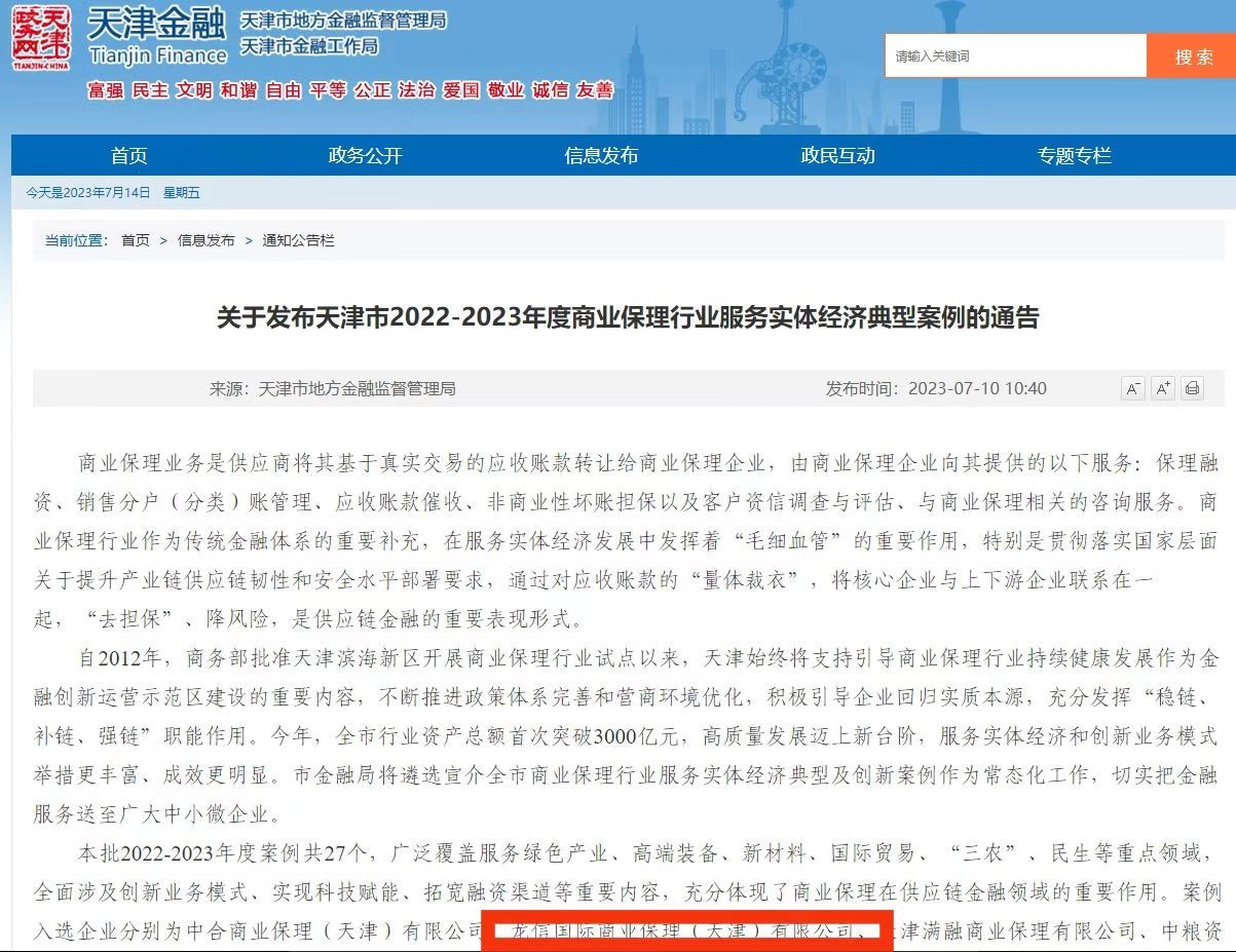 近日,天津市地方金融监督管理局(天津市金融工作局)遴选宣介2022-2023年度天津市商业保理行业服务实体经济典型及创新案例,国控资本公司权属企业龙信国际商业保理(天津)有限公司珠宝门店供应链特色保理业务作为大消费、大民生领域典型创新案例顺利入选。