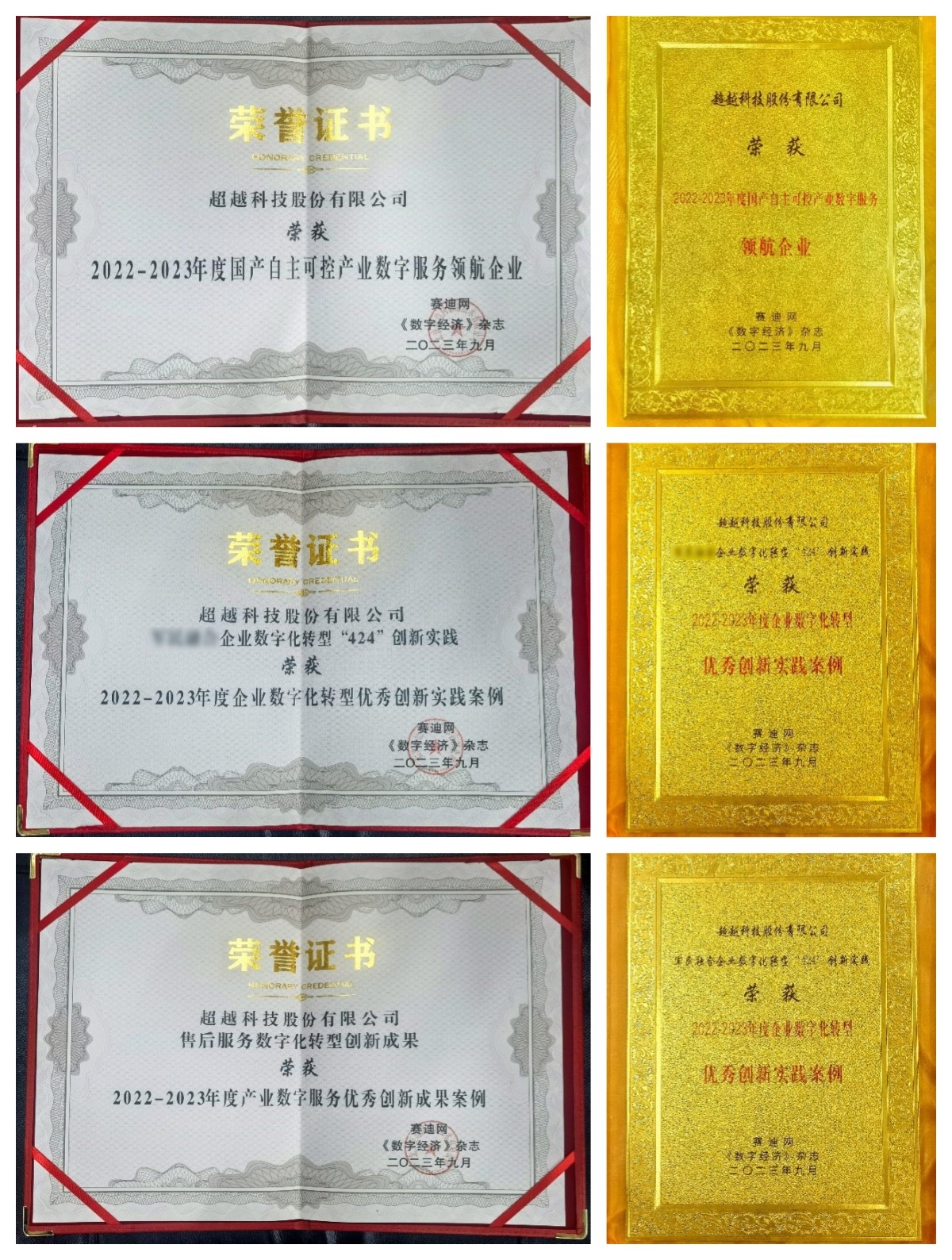 超越科技成功获评“国产自主可控产业数字服务领航企业”,同时申报的“企业数字化转型‘424’创新实践”、“售后服务数字化转型创新成果”分别荣获“企业数字化转型优秀创新实践案例”、“产业数字服务优秀创新成果案例”。