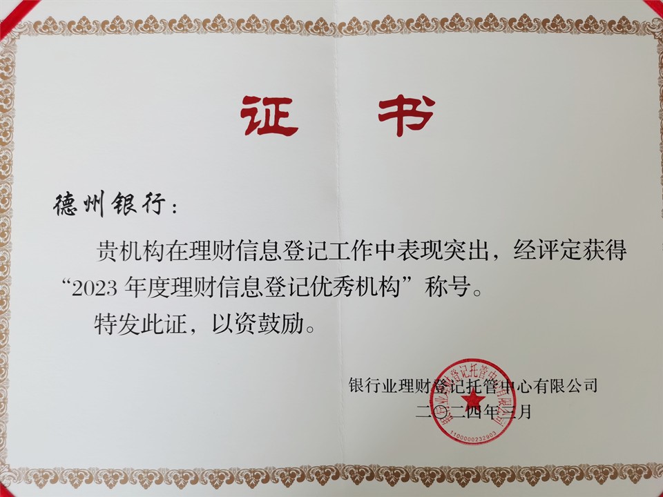 近日,银行业理财登记托管中心公布了2023年度理财信息登记工作评定结果。德州银行荣获“2023年度理财信息登记优秀机构”荣誉称号。