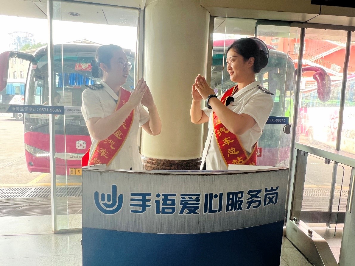 作为山东交运济南长途汽车总站“爱心服务队”中的一员,客运服务部李金达(照片右一)聚焦听障旅客需求,利用业余时间学习手语表达,同时作为站内手语服务岗“老师”,积极带动身边职工共同学习提升,帮助特殊旅客无碍出行。