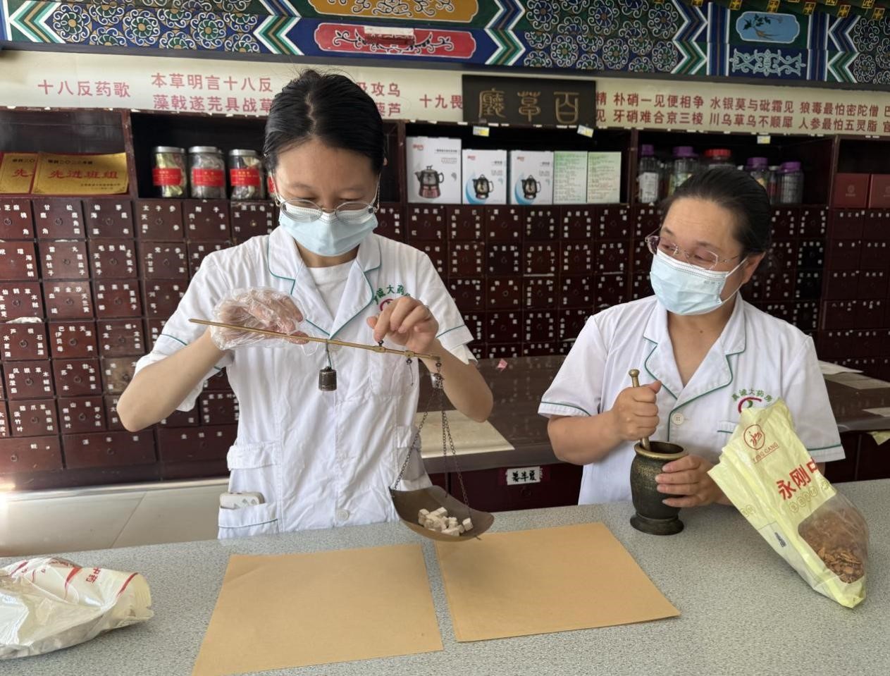 日照真诚医药超市店中药材斗谱前,师傅刘海霞(日照真诚医药超市店店员)向徒弟尹慧慧(日照真诚医药超市店店员)讲解中药材的称量。小尹正小心翼翼地用戥子称量着桌上的茯苓块,眉头紧锁,生怕出错。刘师傅则站在一旁,不紧不慢地用石臼捣着某种干燥的根茎,发出有节奏的沉闷声响。