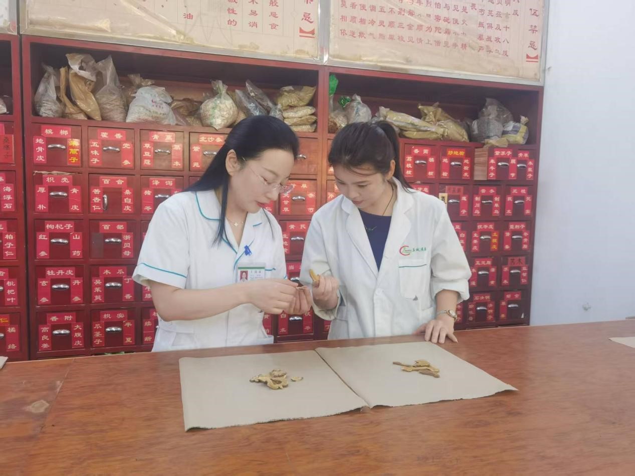 国控资产公司所属莒县真诚大药房第十六药店中药柜前,执业中药师、店长唐翠丽在向年轻店员邹燕讲授中药材的专业知识。同种药材因工艺不同,药材的药性、功效不尽相同。这些知识点对年轻店员而言容易产生混淆。唐翠丽店长通过日常观察,针对员工的专业薄弱点,进行重要知识点梳理,利用空闲时间对店员进行专题培训讲解,从实际出发,切实提升店员整体业务水平。