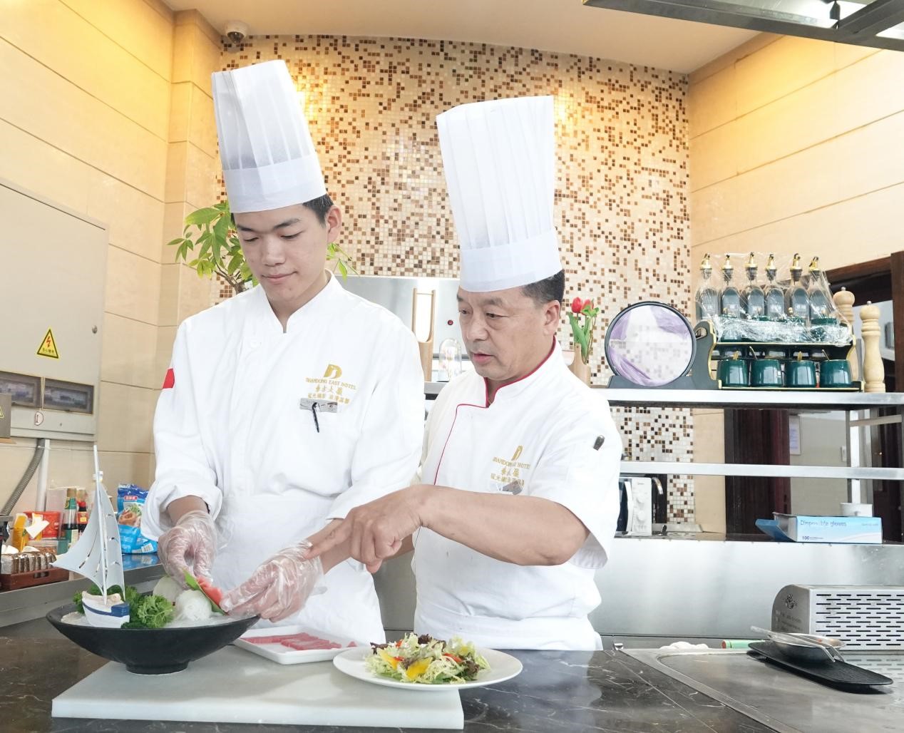 山东东方大厦厨师长宋海洋正俯身指导徒弟进行菜品摆盘装饰。他左手扶着白玉盘沿,右手捏起一朵用萝卜雕刻的月季,示范如何以青瓜丝为衬、樱桃为点缀,在酥锅成品旁摆出“花开富贵”造型。徒弟屏息凝神,用镊子小心调整花瓣角度,案板上散落着切配整齐的香芹与青瓜丝。宋师傅轻声讲解:“摆盘要懂食材性格,酥锅的醇厚得配灵动配色,才不负三小时文火慢炖的功夫。”师徒二人专注的神情,恰似二十一楼炫餐厅琉璃灯下,传统鲁菜技艺与创新美学的无声传承。宋师傅手指萝卜雕花:“你看这月季的弧度,得顺着酥锅的酱色走,刚柔相济才叫摆盘。”徒弟点头应道:“师傅,我这就调整青瓜丝的疏密,让花形更有层次感!”