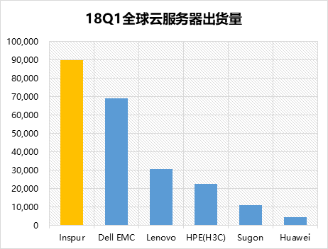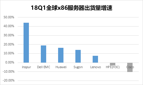 根据Gartner数据,2018年一季度,全球服务器销售额是152.5亿美元,同比增量为40亿美元,同比增速为35.7%,出现了少有的强劲复苏势头。整体市场的竞争格局比较稳定,市场份额前三位是DELL EMC、HPE和浪潮。