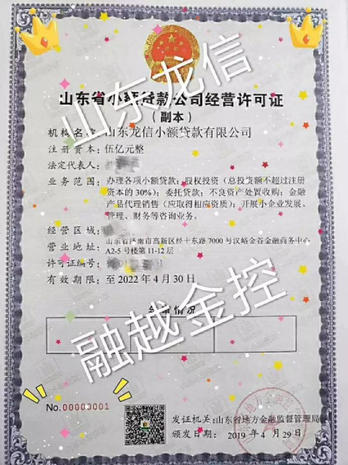 近日,山东省地方金融监督管理局向山东龙信小额贷款有限公司颁发《山东省小额贷款公司经营许可证》,编号为00000001号。经营许可证更有利于公众认知、有效识别正规小额贷款公司,对小额贷款行业规范、健康、有序发展具有里程碑意义。