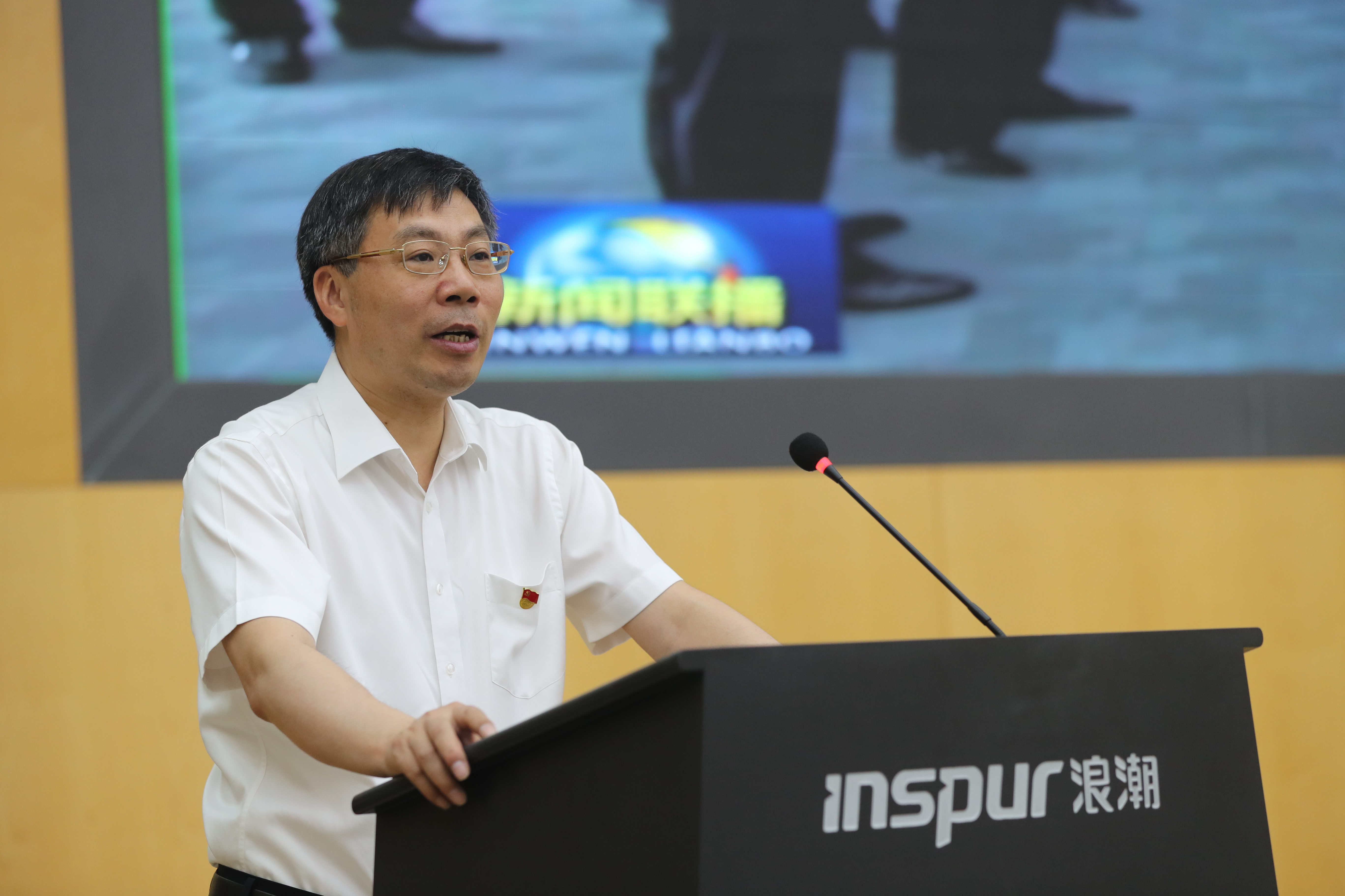 随后,孙丕恕带领大家重温习近平总书记视察浪潮重要讲话精神,并以《牢记总书记嘱托、不负厚望,继续走在前列》为题为党员上党课。孙丕恕表示,总书记视察给浪潮巨大的精神鼓舞,给浪潮注入强大发展动能。一年来,浪潮集团深入开展学习总书记讲话精神、重走总书记视察浪潮之路的活动,全体浪潮人拼搏奋进,集团实力得到极大提升。2018财年,浪潮集团全年申请专利7340项,申请量全国第一,其中服务器领域全部国家标准都是浪潮牵头制定的;服务器稳居全球前三、中国第一,增速全球第一;AI 服务器市场占有率超过50%;浪潮云在政务云市场占有率第一,企业云增速全国第一;爱城市网发展迅速,一贷通得到李克强总理点赞;健康医疗大数据在全国首创“五个一”;智慧城市运营商模式在济南打样成功;ERP集团管理软件连续16年中国市场占有率第一。浪潮集团将结合“不忘初心,牢记使命”主题教育,以习近平新时代中国特色社会主义思想为引领,牢记总书记嘱托,充分发挥党员先锋模范和党组织战斗堡垒作用,带头抓好落实,坚持自主创新,继续走在前列,为早日成为“云+数+AI”的新型互联网企业努力奋进!