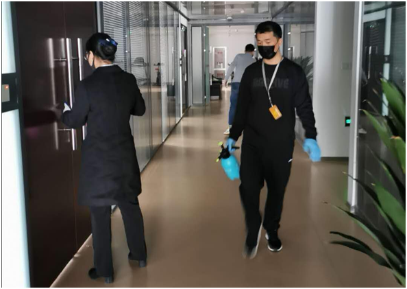 提前进行全面消杀。复工前,公司组织对办公区域进行严格消杀。使用消毒液拖地消毒,办公室、会议室、茶水间、大厅、走廊、墙壁、桌椅、门窗把手等公共空间实行喷洒、擦拭消毒,空调出风、回风口全面消毒、除尘保洁,确保不留死角、不漏盲区。复工后,每天至少全面消杀2次,增加重点区域消毒频次,早、中、晚各打开门窗,自然通风30分钟以上。